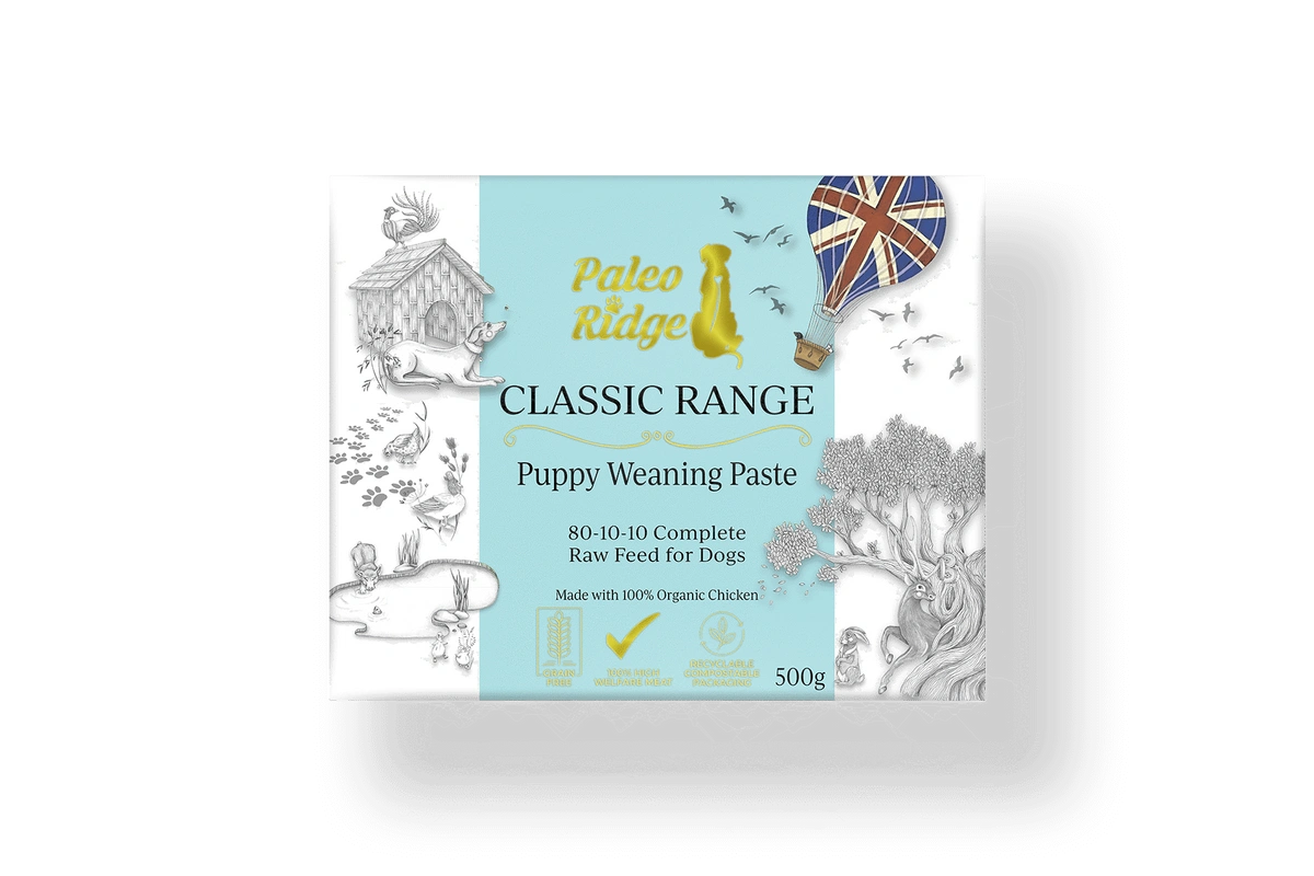 Classic Puppy Weaning Paste is an 80:10:10 complete raw dog food suitable for puppies. This 100% natural puppy food is made with high-quality outdoor-reared beef, organic chicken and zero additives. It is exactly what your puppy needs for a healthy start.
